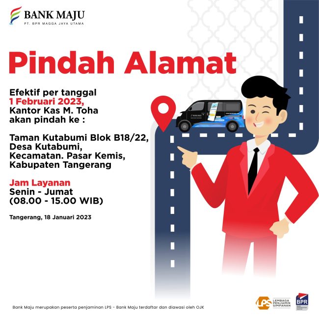 Hallo Sahabat Maju! SAJU mau kasih tahu informasi nih.. Kalau per tanggal 1 Februari, Kantor Kas M. Toha akan pindah alamat ke : Taman Kutabumi Blok B18/22, Desa Kutabumi, Kecamatan. Pasar Kemis, Kabupaten Tangerang. Jam Layanan : Senin – Jumat (08.00 – 15.00 WIB) Kalau kalian mau nabung, deposito ataupun kredit bisa disana ya.. #BankMaju…