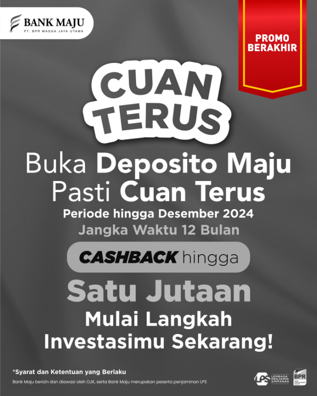 Deposito Maju Dapatkan Cashback Hingga Jutaan! #DepositoMaju yang udah pasti buat kamu #CUANTERUS Dengan deposito mulai dari 5 juta, yang pastinya aman dan dijamin oleh LPS! Periode hingga Desember 2024 Ayo Buka Deposito Sekarang Juga! #BankMaju #Deposito #DepositoBerhadiah #DepositoHadiah #DepositoAman #Hadiah #PromoDeposito #DepositoTangerang #Investasi #DepositoBungaTinggi #Investasi #DepositoBPR #DepositoBank #SimpananDeposito #Simpanan #Menabung #Promo #DepositoMaju #Deposito #LPS