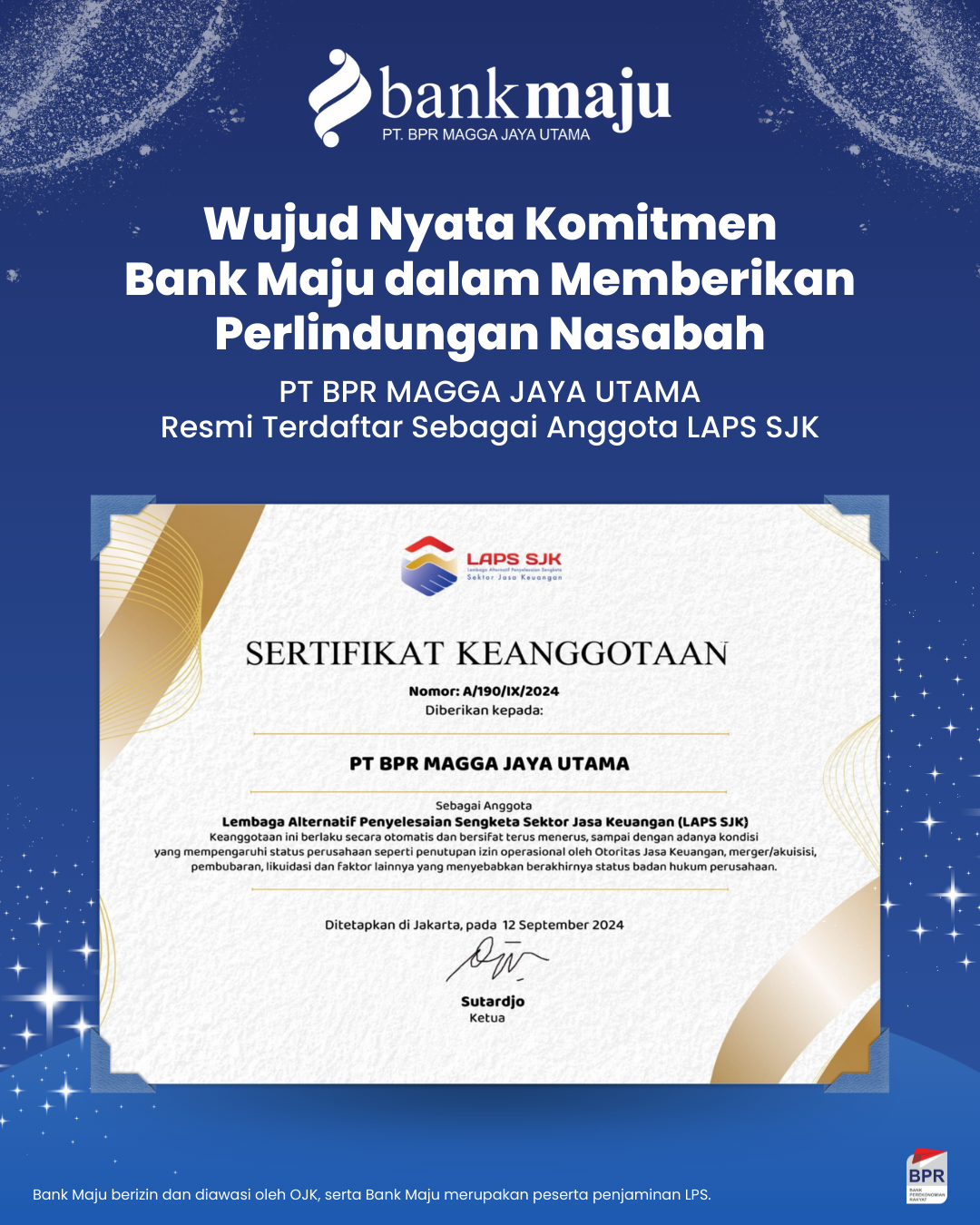 Dengan bergabungnya PT BPR MAGGA JAYA UTAMA di LAPS SJK, kami berharap dapat semakin meningkatkan kepercayaan dan kenyamanan terhadap nasabah dalam bertransaksi serta menjalin hubungan yang lebih transparan dan profesional.