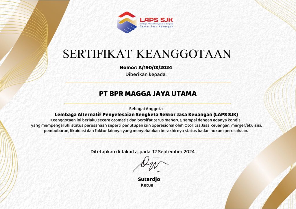 PT. BPR Magga Jaya Utama dengan bangga mengumumkan bahwa kami telah resmi terdaftar sebagai anggota Lembaga Alternatif Penyelesaian Sengketa Sektor Jasa Keuangan (LAPS SJK) dengan Nomor: A/190/IX/2024.